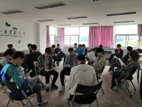 介绍完毕后,参加的同学依次进行了自我介绍,以增强相互之间的了解。团体辅导的第一个心理游戏是自我想象的游戏,葛老师通过猴子、蛋等生物来做比喻,让学生们通过两两之间剪刀石头布进行PK,来不断进行角逐和晋级,而最后落单的同学则要在圆圈中央向大家讲述内心的感想。这个热身小游戏一下子将活动气氛活跃起来,大家之间的陌生感也少了很多,都积极主动地同身边同学交流起来。