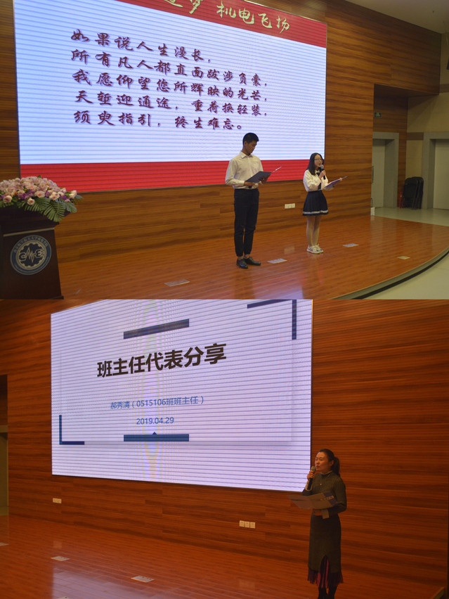 全院育人,润物无声,学院教工全心全意践行立德树人。沙画视频《老师的一天》通过独特的视角、平实的叙述,讲述了老师辛勤工作的一天,展现了老师对学生从学习到生活,从身体健康到思想动态等多方面、多角度地关心和爱护,凸显了全院育人、人人争先的良好氛围。学院18级学生司马怡聃独立创作的诗朗诵《老师,我想对你说》表达了机电学子对广大老师们的感激、爱戴和真挚的祝福。随后,班主任代表郝秀清老师通过她与0515106班学生的故事,从班主任与辅导员的区别、什么时候应该联系班主任、班主任可以为学生提供哪些帮助三个方面阐述了她对“班主任”这一身份的理解和感悟,展现了班主任对班级同学成长成才的殷切期望。