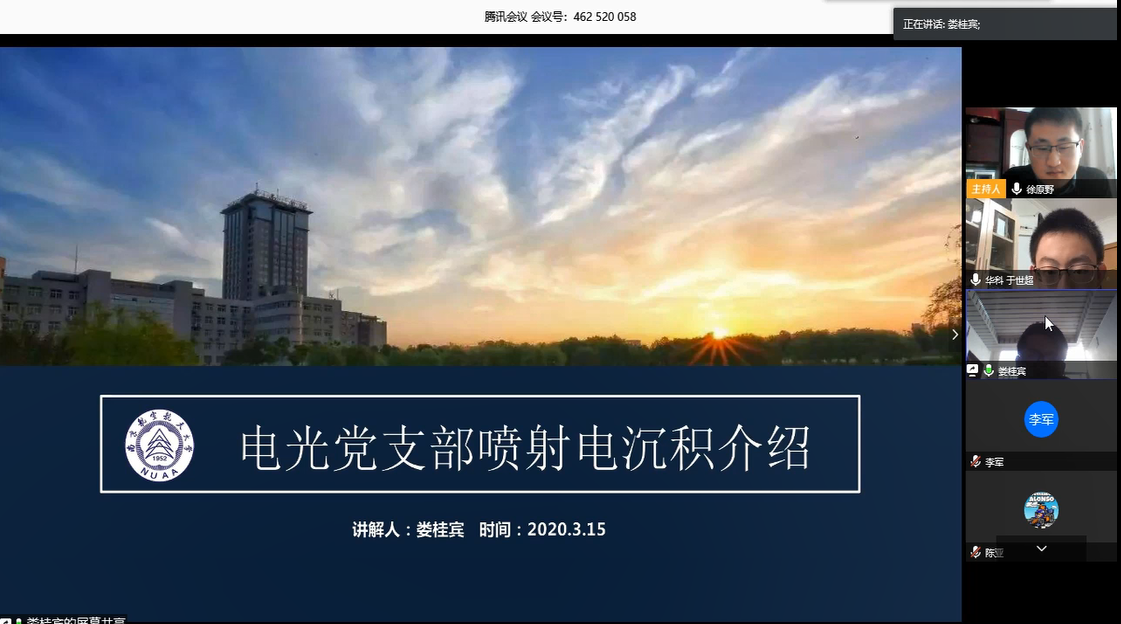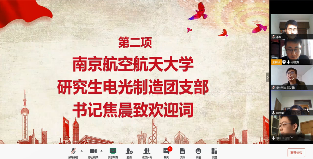 本次联合团日活动依托腾讯会议平台在线上开展。参与此次团日活动的包括华中科技大学机械科学与工程学院硕士1906团支部团员和与黄色动漫 研究生电光制造团支部团员,活动还邀请了电光制造团队田宗军教授、沈理达教授和邱明波副教授观摩指导。本次活动由电光制造团队徐原野主持,活动内容共分为五项。