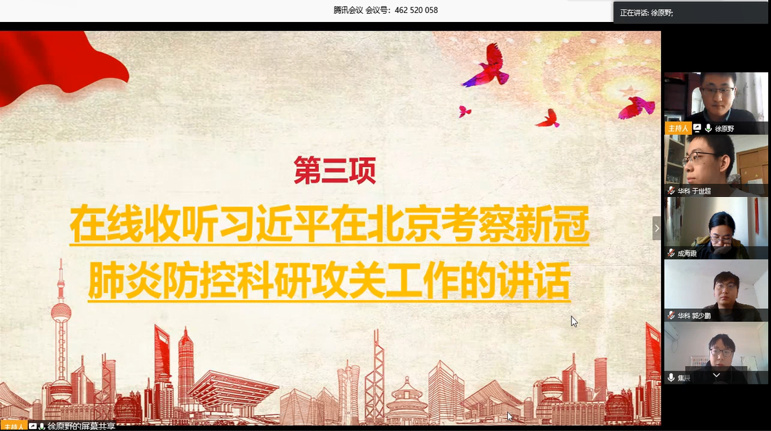 紧接着,全体成员在线收听习近平总书记在北京考察新冠肺炎防控科研攻关工作的重要讲话。自新型冠状病毒爆发以来,党和国家高度重视。在3月2日下午,习近平总书记亲自来到科研防“疫”一线,看望慰问一线科研工作者并提出殷切期望。总书记的期望对我们研究生具有重要指导意义,全体团员认真聆听总书记的嘱托。