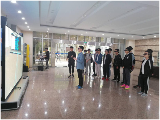 首先,在实验室研究生的带领下,同学们参观了利用虚拟现实技术进行模拟装配的项目。利用虚拟现实技术,穿着头戴设备,就能直接模拟完整的装配过程。同学们佩戴3D眼镜进行观看,就像穿越到C919机翼装配车间,直观地感受了一次C919机翼的装配全过程。这项技术不仅只适用于模拟装配,同时,利用VR虚拟现实技术搭建的智能装配课堂,学习者可通过VR设备在教室中体验到工厂和实验室中的实际装配步骤。该项技术能够很好地弥补理论教学的不足,让学习者亲身了解到装配的过程和设备,积累宝贵的实践经验。