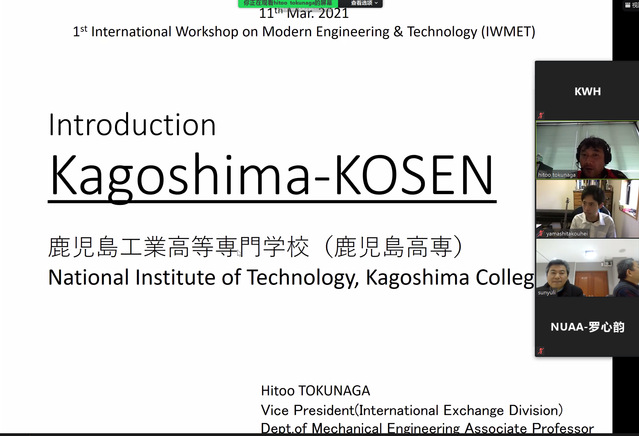 3月11日上午,“1st International Workshop on Modern Engineering & Technology (1st IWMET)”线上本科毕设答辩会议在明故宫校区15号楼341会议室举行。日方参加此次会议的主要人员有:分管国际交流的副校长H. Tokunaga教授及K. Shimana教授、Y. Kobaru教授、Y. Kawano教授等,本科生Tomoyuki Hirotani和Kouhei Yamashita等10余人;我院参会的主要人员有:左敦稳教授、孙玉利教授以及部分研究生、大四年级本科生10余人。会议由日本鹿儿岛工学院副校长Hitoo Tokunaga教授主持。