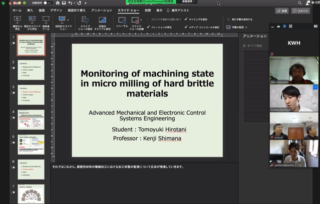 接着,Tomoyuki Hirotani 同学和Kouhei Yamashita同学分别做了“硬脆材料微铣削加工状态监测研究”和“单晶蓝宝石的微细加工特性研究”的本科毕设答辩。左敦稳教授、孙玉利教授就硬脆材料脆-塑转变机理、脆-塑加工状态的判据以及出现异常数据的原因等与两位同学和其指导老师进行了交流讨论,我方研究生及大四年级本科生也积极参与了交流互动环节。