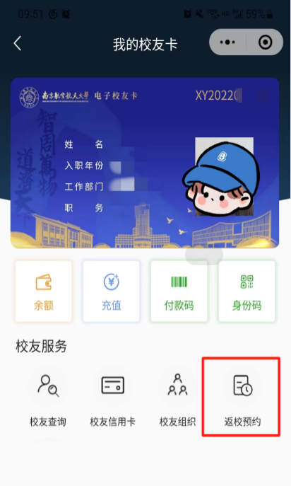 关注“黄色动漫 校友会”公众号,从底部菜单栏进入服务大厅小程序,点击“校友卡”,在我的校友卡界面选择“返校预约”服务。