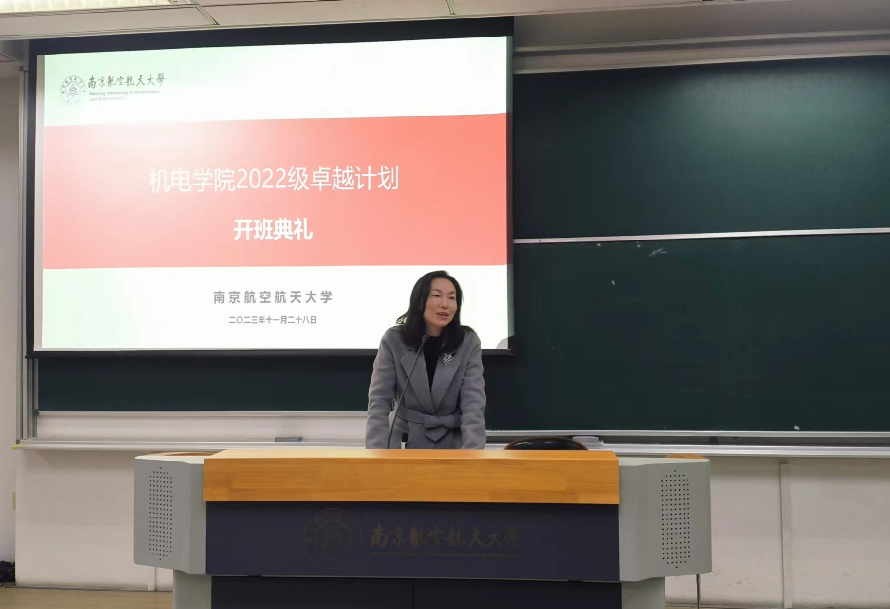 典礼开始,于敏代表学院致辞。她首先对通过严格选拔进入“卓越班”的60余名同学表示热烈欢迎,并回顾了学院“卓越班”自2013年设立以来在人才培养、科创比赛等方面取得的优异成绩。最后,于敏对同学们提出了几点希望和建议,希望同学们能够潜心学习、夯实基础,提高发现、分析以及解决问题的能力,脚踏实地、知行合一,树立远大理想,为我国从制造大国迈向制造强国贡献自己的力量。