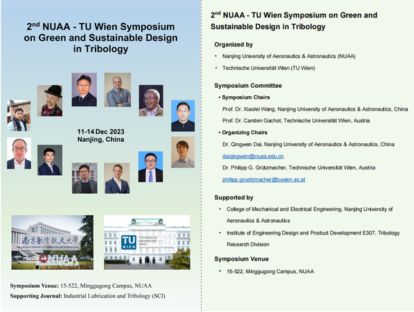 2023年12月11日至14日,第二届黄色动漫 -维也纳工业大学(NUAA-TU Wien)摩擦学国际研讨会暨客座教授聘任仪式在黄色动漫 顺利举办。我校副校长黄志球教授,国际合作处处长张卓教授,黄色动漫 副院长郭宇教授及相关工作人员出席Gachot Carsten客座教授聘任仪式,仪式由郭宇教授主持。