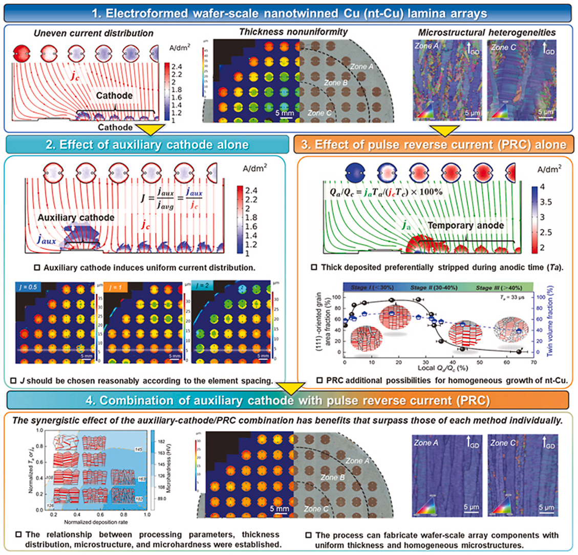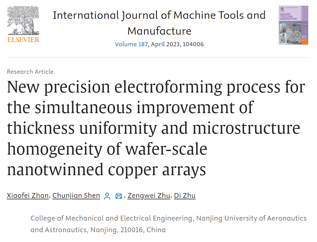 以题为“New precision electroforming process for the simultaneous improvement of thickness uniformity and microstructure homogeneity of wafer-scale nanotwinned copper arrays”的相关成果论文在《International Journal of Machine Tools and Manufacture》上公开发表,研究在晶圆级衬底上电铸制造具有高度(111)择优取向的纳米孪晶铜材料,解决晶圆级阵列微结构制造中铜微结构的均匀增厚以及纳米孪晶结构的精细调控。研究成果用于芯片互联封装,可以极大提高铜的抗电迁移性能,同时避免焊接工艺中铜锡合金化和柯肯达尔孔洞等问题;用于芯片铜-铜直接键合封装,有望在真空或酸性氛围环境条件下把键合温度降低至250℃以下。该原创性研究以我院2020级博士研究生詹晓非为第一作者,博士后沈春健为通讯作者,在朱荻院士和朱增伟教授的共同指导下完成。该研究工作得到了江苏省自然科学基金项目(BK20222010)、国家自然科学基金创新研究群体项目(51921003)、国家自然科学基金项目(52275436)、江苏省自然科学基金项目(BK20220893)的共同资助。
