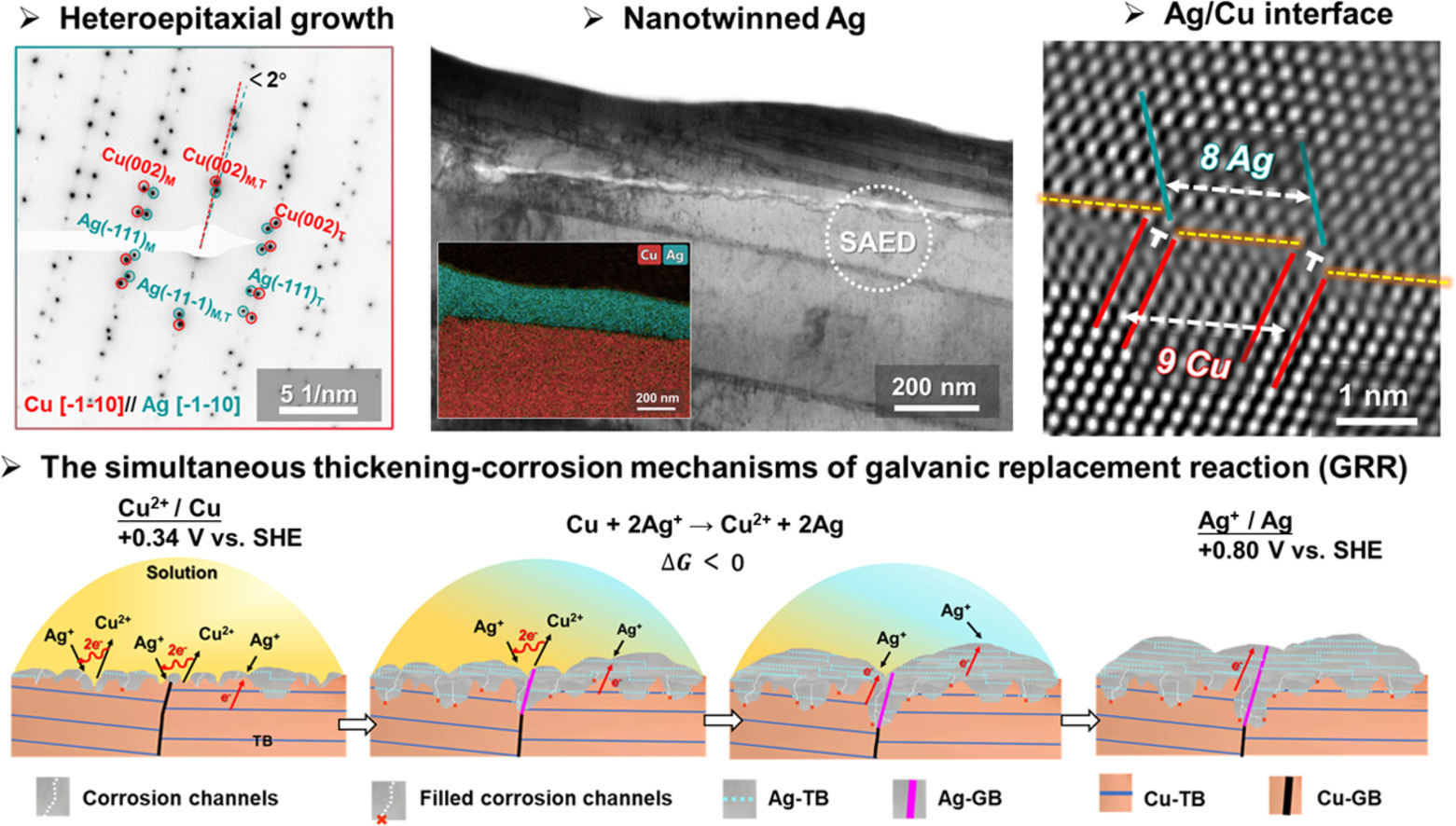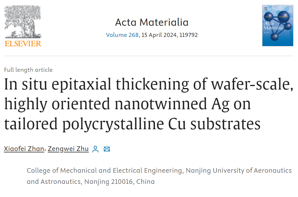 以题为“In situ epitaxial thickening of wafer-scale, highly oriented nanotwinned Ag on tailored polycrystalline Cu substrates”的相关成果论文在《Acta Materialia》上公开发表,在晶圆级衬底电铸纳米孪晶铜表面上,原位外延生长出无过渡层的具有高度(111)择优取向的纳米孪晶银膜。所获得的纳米孪晶银膜成功复制了铜衬底的晶体学信息,表现出局部单晶状和优异的热稳定性。研究成果用于芯片铜-铜直接键合封装,有望在空气环境下实现180℃低温高质量键合,而且与现有的电镀铜制程工艺具有良好的兼容性。该原创性研究以我院2020级博士研究生詹晓非为第一作者,朱增伟教授为通讯作者。该研究工作得到了国家自然科学基金项目(52275436)和江苏省自然科学基金项目(BK20222010)的资助。