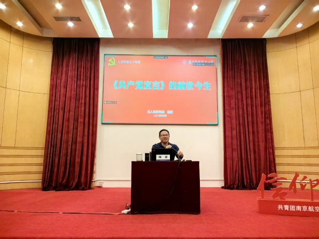 无人机研究院党委副书记、副院长杨波以《〈共产党宣言〉的前世今生》为题作报告,从《共产党宣言》的取名、诞生、内容、关键词和力量,全面介绍了《共产党宣言》的前世今生,带领同学们在历史中感悟马克思主义的诞生对全世界的无产阶级革命运动起到的推动作用,感悟《共产党宣言》在百年之后依然在影响中国、推动中国的发展。