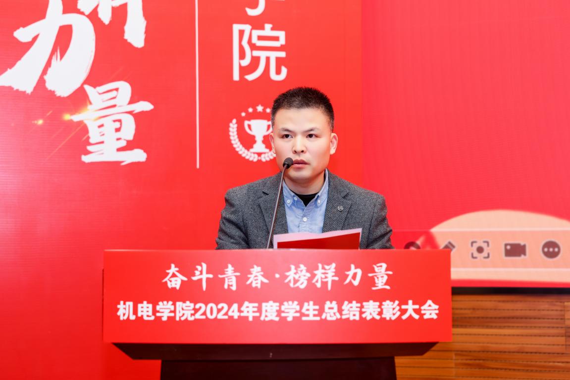 最后,刘虎对本次表彰大会致辞。他表示,今天的表彰大会,不仅是一场朋辈引领的榜样事迹分享会,更是一堂筑梦育人的思政公开课。他对同学们提出了三点要求:要坚定理想信念、厚植家国情怀,要坚持科技创新、练就过硬本领,要矢志拼搏奋斗、勇担时代重任。他强调,新时代呼唤新作为,新征程须有新担当,希望机电学子在推进强国建设、民族复兴伟业中展现青春作为、彰显青春风采、贡献青春力量。