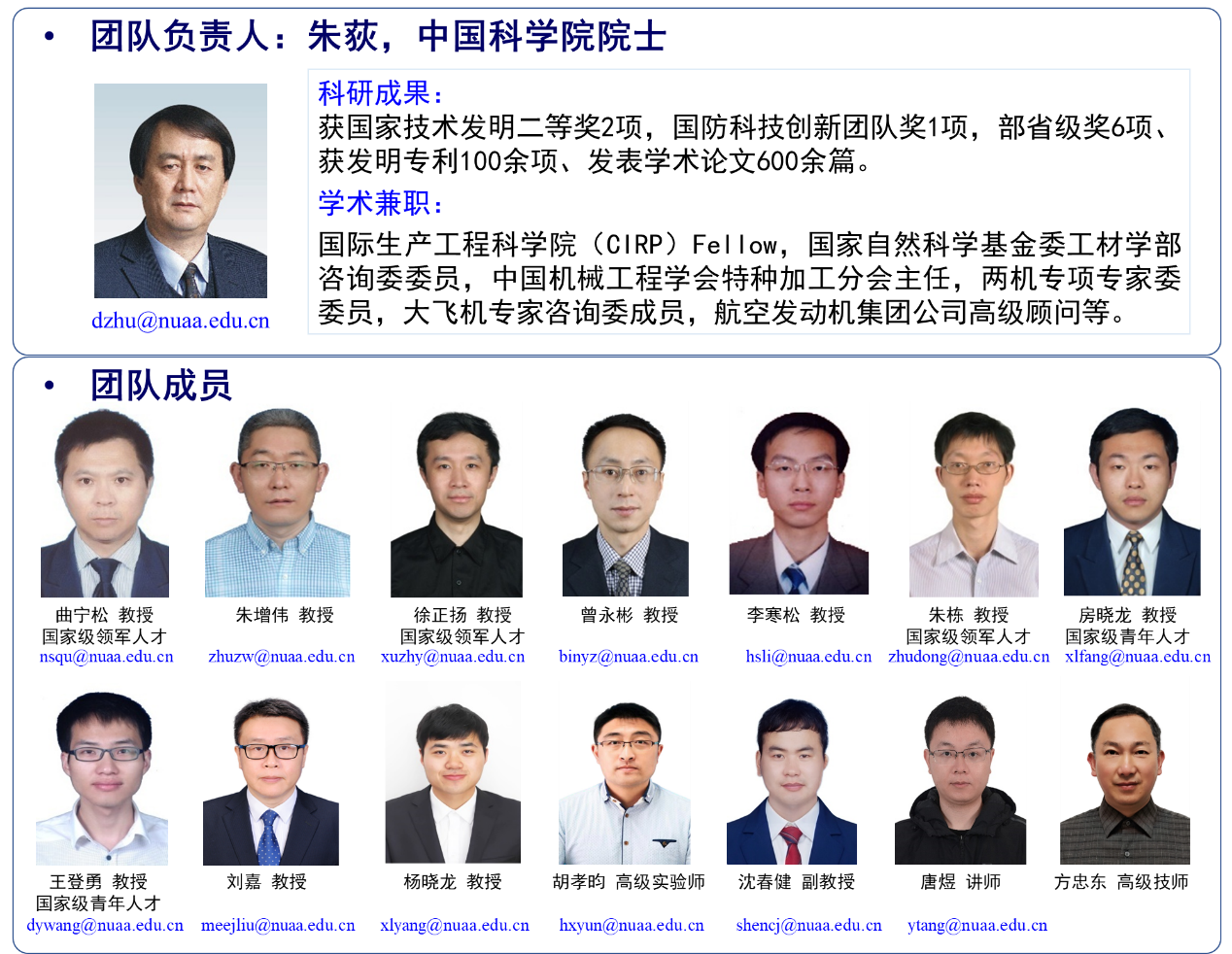 特种能场制造技术创新团队由中国科学院朱荻院士领衔,包括教授11名,拥有国家重大人才工程C类特聘教授和青年学者、国家重大人才工程B类领军人才等国家级人才10人次,博士/硕士研究生150余名。团队始终面向航空航天领域重大需求,开展特种能场制造的基础理论—关键技术—机床装备—工程应用的全链条研究。近年来,团队先后牵头承担两机专项、国家重点研发计划、173计划、国防基础科研重大项目/重大工程、国家自然科学重点基金等重要科研项目十余项。