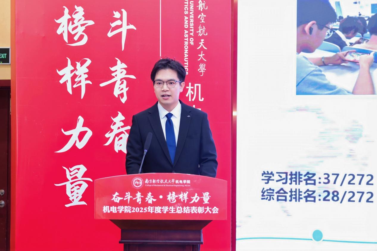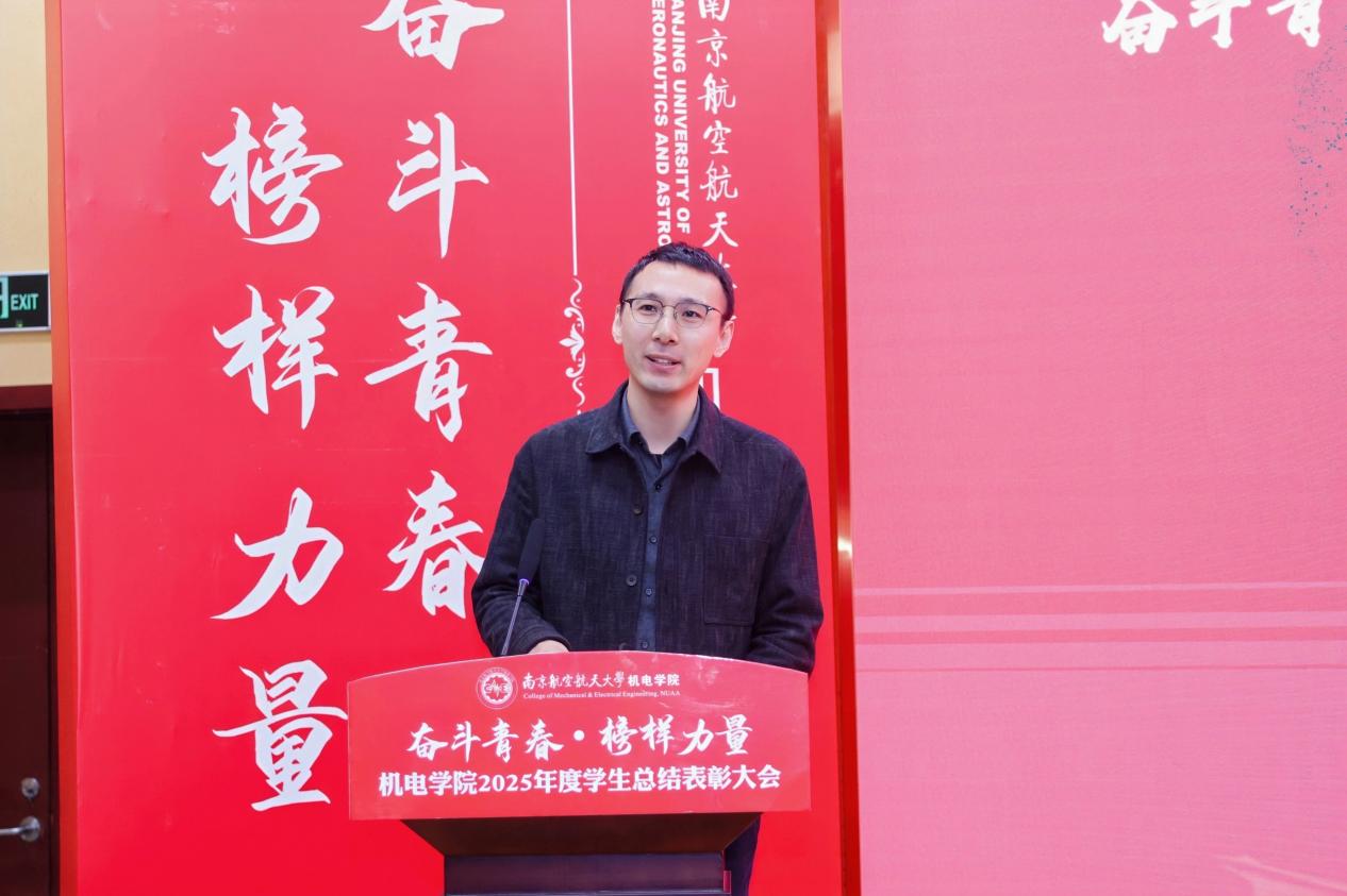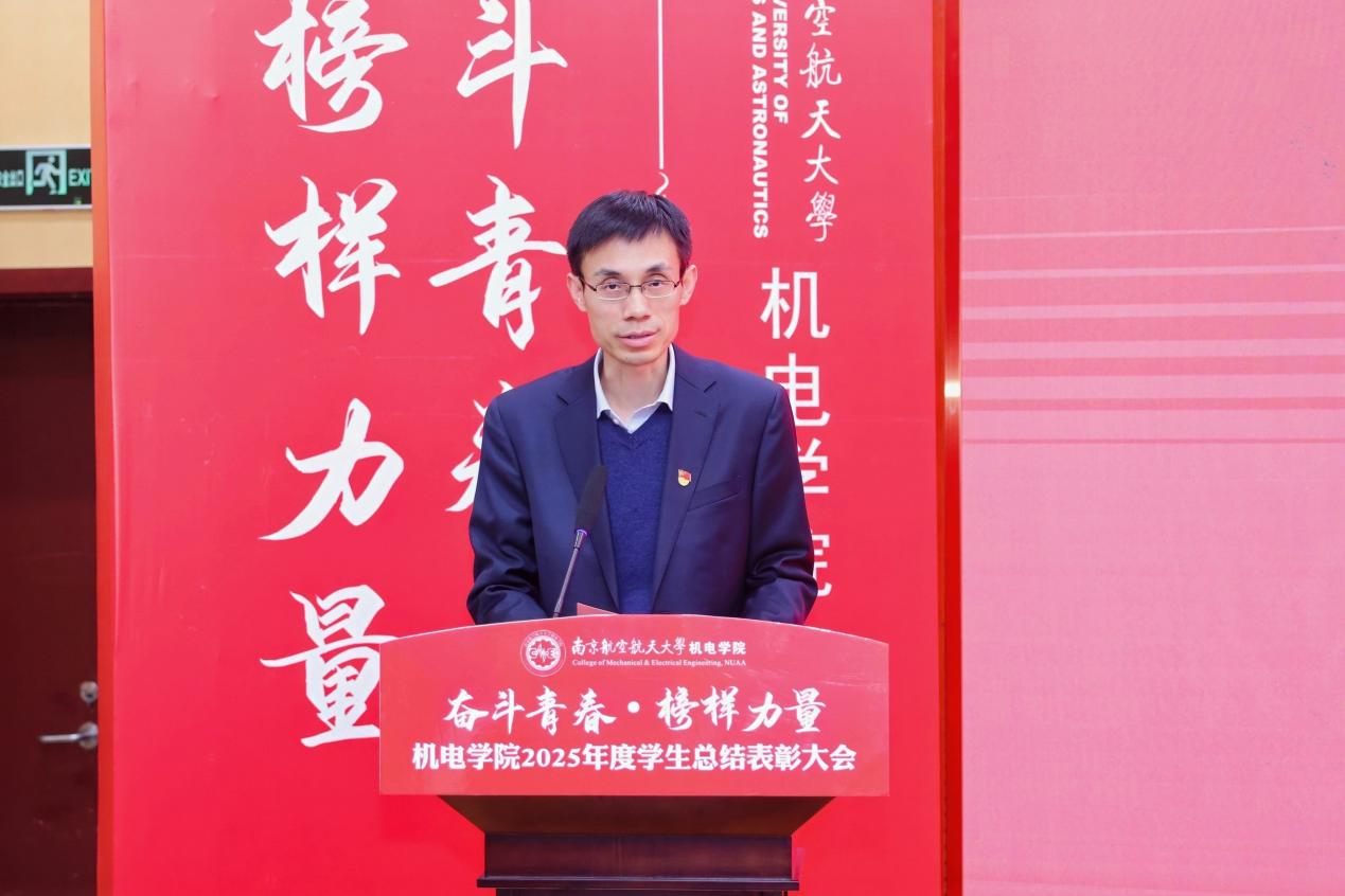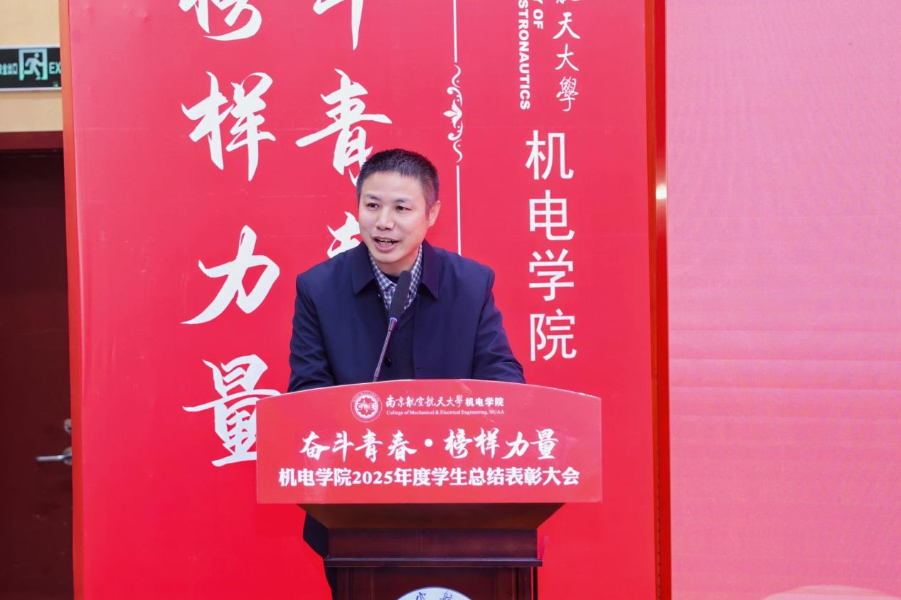 大会最后,黄色动漫 党委书记刘虎作总结讲话。他代表学院向获奖集体与个人表示祝贺,向设奖单位及校友表示感谢。刘虎书记指出,本次大会既是一次榜样事迹分享会,也是一堂生动的思政公开课。他勉励全体机电学子要铸牢信仰之基,将个人理想融入国家航空航天事业大局;要锤炼过硬本领,勇于攀登科技高峰,助推高水平科技自立自强;要永葆奋斗之姿,勇担时代重任,在推进强国建设、民族复兴的伟大实践中书写无愧于时代的青春篇章。
