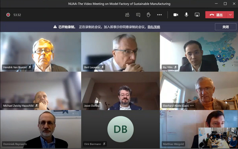 Professor Ning He from NUAA presided over this conference. Firstly, he briefly explained the construction assumption of sustainable manufacturing model factory under the policy background and national strategy for the 14th Five Year Plan. Afterwards, Professor Matthias Weigold introduced the construction experience of ETA factory in Germany. Then, every expert shared their views on the latest research progress and future development trend of sustainable manufacturing. All experts agreed that sustainable manufacturing model factory construction plan proposed by NUAA is fully in line with the trend of international sustainable development requirements, and building a platform for interdisciplinary teaching and scientific research would greatly promote international exchanges and cooperation. Experts also put forward specific suggestions on the teaching and scientific function modules of the factory. After meeting, Professor Hendrik Van Brussel sent an email to propose written suggestions on the research direction, and expressed his interest in educational cooperation between NUAA and KU-Leuven.